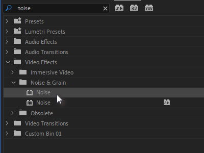 ![]() V oknu Effects pod Video Effects, Noise & Grain primite z miško Noise ter ga prav tako povlecite na Adjustment layer. |