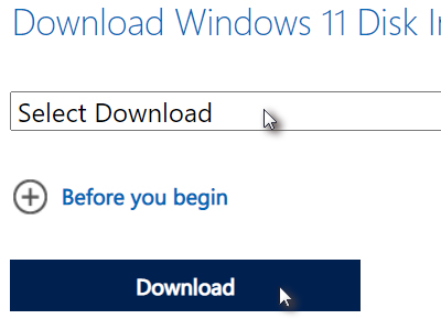 Na tej strani prenesite Windows 11, kjer izberete Prenos posnetka diska (ISO) za Windows 11.