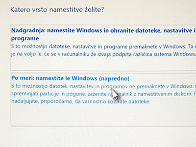 ![]() Jaz bom celoten računalnik pobrisal, zato bom izbral Po meri: namestite le Windows (napredno). |