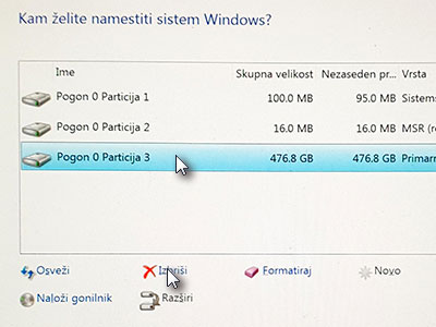 ![]() Ko se vam prikaže diskovje, najprej vse pobrišite (Izbriši), ustvarite novo (Novo) in nato izberite Particijo, na katero želite namestiti Windows 11. Če kaj ni jasno, vprašajte na forum. |