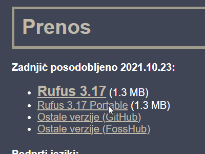 ![]() Na tej strani prenesite program Rufus, s katerim boste ustvarili namestitveni USB. Izberite možnost Portable. |