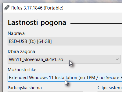 ![]() Ko se vam Rufus prenese, ga odprite. Izberite prej preneseno ISO datoteko Windows, potem pa Možnosti slike nastavite no TPM / no Secure Boot. |