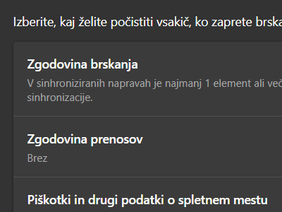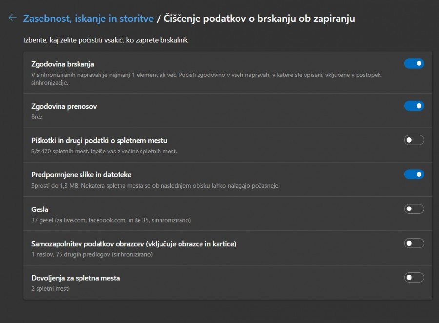 ![]() ... katere lahko označite, da se bodo pobrisale ob zaprtju brskalnika Edge. Piškotke in shranjena gesla priporočamo, da ne označite, saj boste morali v tem primeru vedno vnašati gesla in prijave v spletne strani. |