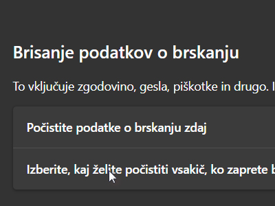 ![]() Potem pa v polju Brisanje podatkov o brskanju kliknite na Izberite, kaj želite počisitit vskaič, ko zaprete brskalnik. |
