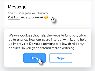 ![]() V polje Message vpišite po želji poljubno sporočilo. Potrdite na gumb Okay, da skrijete okno z obvestilom o uporabi piškotkov. |