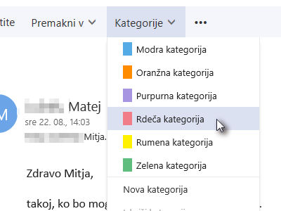![]() Ko bo sporočilo označeno, pa kliknite zgoraj na Kategorije in nastavite poljubno barvo, ki bo predstavljala kategorijo.