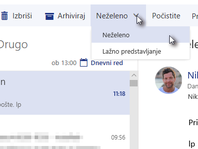 Kliknite na puščico, ki se nahaja poleg gumba Neželeno in izberite Neželeno.