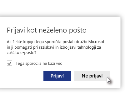 ![]() Outlook vas vpraša, če želite sporočilo tudi prijaviti družbi Microsoft, ki lahko to sporočilo nastavi kot neželeno tudi drugim osebam širom sveta.