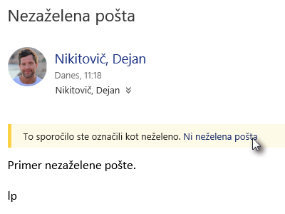 Označite sporočilo in če ga želite nastaviti ponovno kot normalno, kliknite na povezavo Ni neželena pošta.