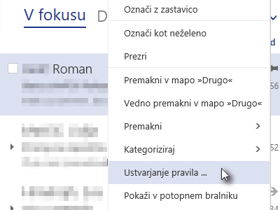 ![]() Potem pa v mapi Prejeto označite osebo, kateri želite nastaviti pravilo, z desnim miškinim gumbom in izberite Ustvarjanje pravila … |