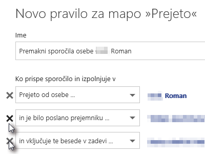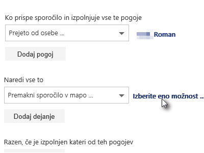 Tokrat želimo nastaviti le pravilo, ki bo vsa sporočila od neke osebe premikal v drugo mapo. Ne pa, da preverja še, komu je bilo poslano in katere besede vključuje.