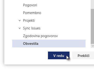 ![]() Označite map, v katero želite premikati sporočila in kliknite na gumb V redu.