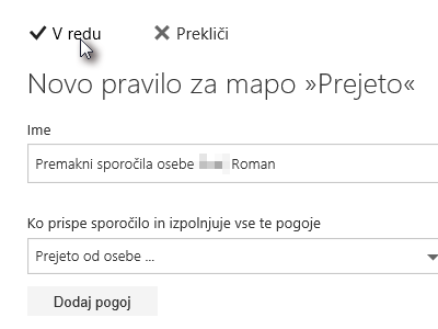 ![]() Pravilo za premik sporočil od ene osebe v določeno mapo je nastavljeno.