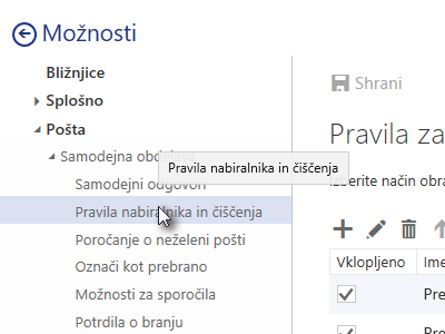 ![]() V oknu z nastavitvami se premaknite v Pošta, Samodejna obdelava in nato izberite Pravila nabiralnika in čiščenja.