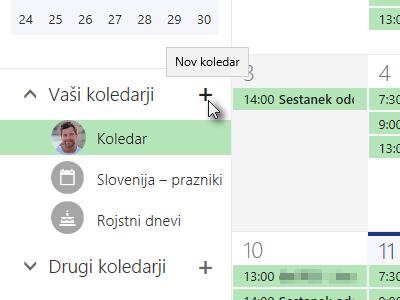 V polju s koledarji kliknite na ikono za Nov koledar (glej sliko).