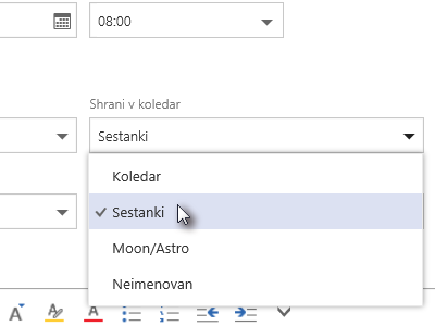 Pri ustvarjanju novega dogodka pa potem v izbirniku Shrani v koledar izberite poljuben koledar, ki ste ga ustvarili (glej sliko).