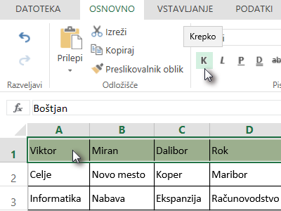 ![]() Označite ponovno neke poljubne celice in odebelite pisavo tako, da kliknete na ikono Krepko (glej sliko). |
