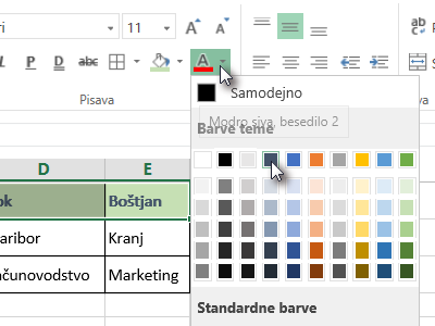 ![]() Označite ponovno neke poljubne celice in spremenite barvo pisave tako, da kliknete na ikono Barva pisave (puščico navzdol, glej sliko) in izberete poljubno barvo. |