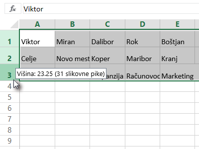 ![]() Potem pa z miško med te označene vrstice držite na razmaku (črtica), da boste lahko vsem vrsticam spremenili višino (glej sliko). |