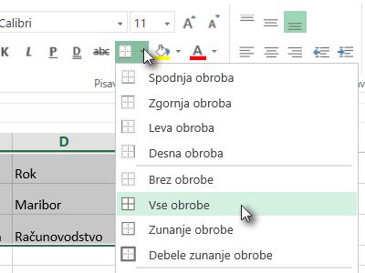 ![]() Kliknite na ikono Obrobe (puščico navzdol, glej sliko) in nato izberite Vse obrobe. |