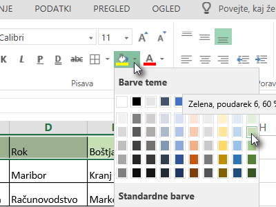 ![]() Z miško označite nekaj celic, potem pa kliknite na ikono Senčenje (puščico navzdol, glej sliko) in izberite poljubno barvo. |