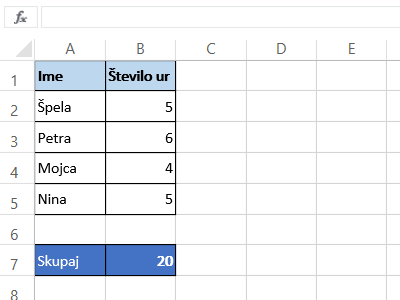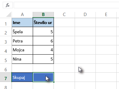 Torej imejte neke številke v celicah in potem kliknite v celico, kjer boste sešteli vsa ta števila v celicah (glej sliko).