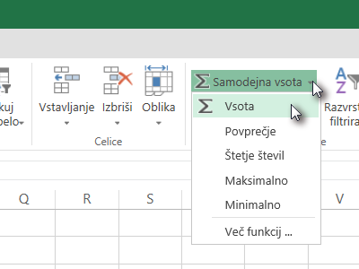 ![]() Kliknite z miško na ikono Samodejna vsota (puščica navzdol, glej sliko) in nato izberite Vsota. |