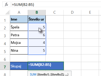![]() Excel od vas pričakuje, da z miško označite vse celice, od katerih želite, da se izračuna vsoto.