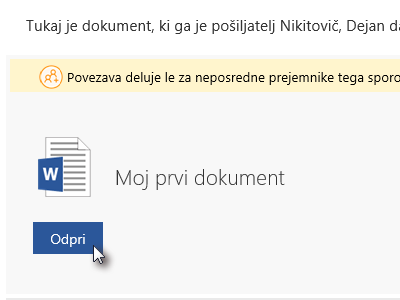 ![]() Sodelavke in sodelavci bodo v Outlook prejeli sporočilo z vabilom, kjer kliknejo na gumb Odpri (glej sliko). |