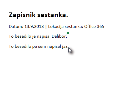 ![]() Tako lahko hkrati urejate dokument skupaj in barve zastavice označujejo osebe, ki sodelujejo (glej sliko). |