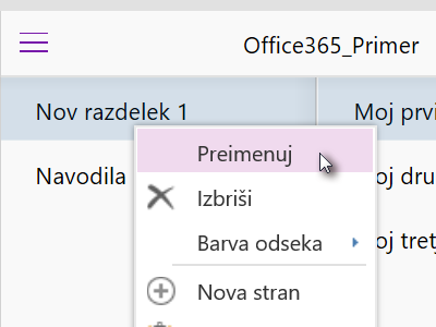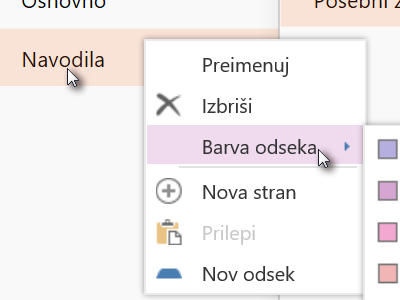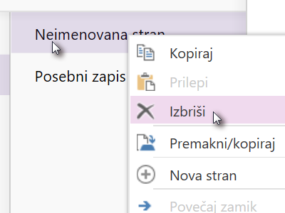 ![]() Kliknite z desnim miškinim gumbom na razdelek ali zapisek (stran) in izberite Izbriši, če ga želite pobrisati. |