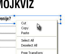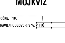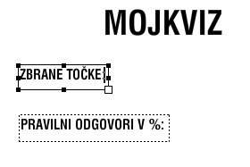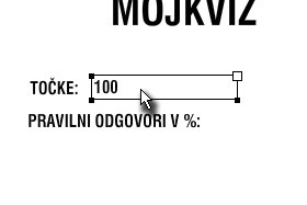 stop(); percent=score/1*100 + "%"; V primeru, da imate še vmesne frame-e z več vprašanji, v tiste frame vpišite samo skripto stop (stop();). Na koncu skripte pa lahko skripto prilagajate številom vprašanj. Če imate npr. 6 vprašanj, bo na koncu pisalo 6*100 in ne 1*100. Sedaj pa samo kliknite na Ctrl + ENTER in si oglejte vaš, upam, da ne preveč težek, kviz :) Kliknite tukaj, da si ogledate moj primer. |