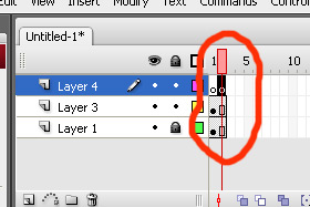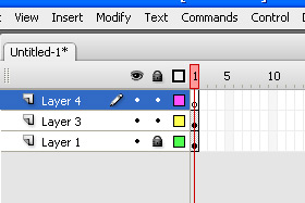 Nato označite prvi frame pri vseh treh layerjih in pritisnite na F6, da dodate nov keyframe na naslednji (drugi) frame (glej sliko).