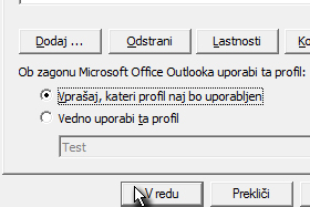 Vedno, ko bomo zagnali Outlook, nas bo vprašal, kateri profil želimo uporabljati.