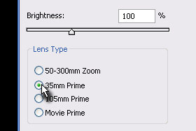 Brightness določite 100 % in Lens Type 35mm Prime.