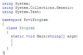 Programsko kodo naše prve konzolne aplikacije bomo napisali v metodo Main, zgleda pa takole: