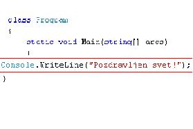 static void Main(string[] args) { Console.WriteLine("Pozdravljen svet!!"); } Bodite pozorni na velike začetnice, pike ter ne pozabite podpičja ( ; ) na koncu vsakega stavka! |