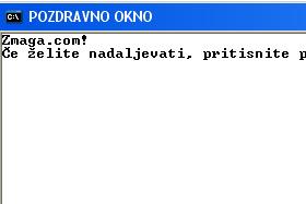 Če damo pred stavek // pomeni da je to samo komentar ki ga program ne prevede. //barva ozadja bo bela Console.BackgroundColor = ConsoleColor.White; //celo okno bo belo Console.Clear(); //barva pisave bo črna Console.ForegroundColor = ConsoleColor.Black; //napis na oknu Console.Title = "POZDRAVNO OKNO"; //zvočni signal, s frekvenco 1000 HZ, ki traja 500 milisekund Console.Beep(1000,500); |