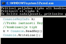 Console.Write("Pritisni poljubno tipko ali kombinacijo tipk: "); //Funkcija ReadKey vrne vrdnost tipa ConsoleKeyInfo ConsoleKeyInfo k; //Preko lastnosti KeyChar spremenljivke tipa ConsoleKeyInfo dobimo oznako tipke oz. oznako //kombinacije tipk k = Console.ReadKey(); Console.WriteLine(); Console.WriteLine("Pritisnil si tipko "+k.KeyChar); |