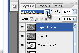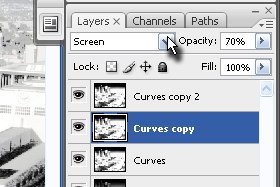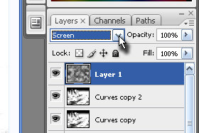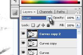 Označite nato Curves copy layer in mu nastavite senčenje na Screen (glej sliko). |