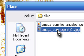 Več slik ognja najdete na tej povezavi. Kliknite nato zgoraj na File in izberite Place... V novem oknu z raziskovalcem označite sliko prenesenega ognja in kliknite na gumb Place. |