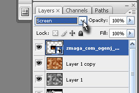 Potem pa kliknite zgoraj na Filter, Render in izberite Clouds. Določite layerju z ognjem senčenje na Screen (glej sliko). |
