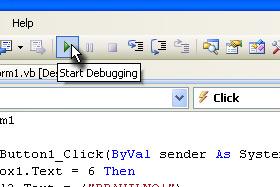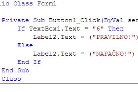 If TextBox1.Text = "6" Then Label2.Text = ("PRAVILNO!") Else Label2.Text = ("NAPAČNO!") End If S tem smo dodali If stavek, ki bo samodejno vpisal tekst v naš Label, ki smo ga pred tem z brisanjem besedila skrili. Vsi If stavki se zaključujejo z "End If", vendar vam tega ni treba naknadno vpisovati, saj ponavadi program sam napiše konec stavka, če pa se to ne zgodi, dopišite še to (glej sliko). Kaj smo s tem ukazom pravzaprav naredili? If stavek je podobno, kot uporabljamo besedo "Če". Če se bo zgodil pogoj, ki ga preverjamo, potem se bo izvedla stvar, ki ji sledi, v nasprotnem primeru pa se bo izvedla koda, ki sledi Else. Preprosto, kaj ne? |