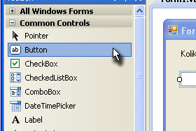 Vzemite sedaj orodje Button, s katerim boste na obrazec dodali nov objekt tipa Button.