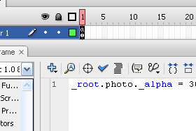 Pritisnite tipko F9 in in vnesite naslednjo kodo: on (rollOver) { _alpha = 350 } on (rollOut) { _alpha = 170 } |
