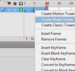 Potem potegnemo od Frame 1 do 10, kliknemo na desni miškin gumb in izberemo Create Shape Tween.