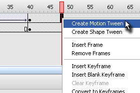 Pri novo ustvarjenem layerju kliknite na oba dela (med 1-40 in 40-100) z desnim miškinim gumbom in izberite Create Motion Tween.