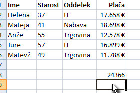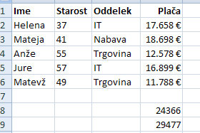 Excel vam bo seštel plače obeh zaposlenih v trgovini (Anže in Matevž).