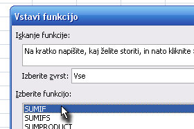V novem oknu pod zvrst določite Vse in funkcijo označite SUMIF.