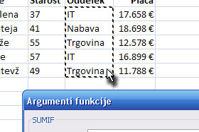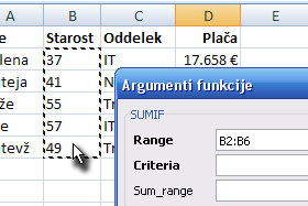 Ko se odpre okno z argumenti funkcije, označite polje Range (verjetno je že) in nato celice, ki predstavljajo oddelek.